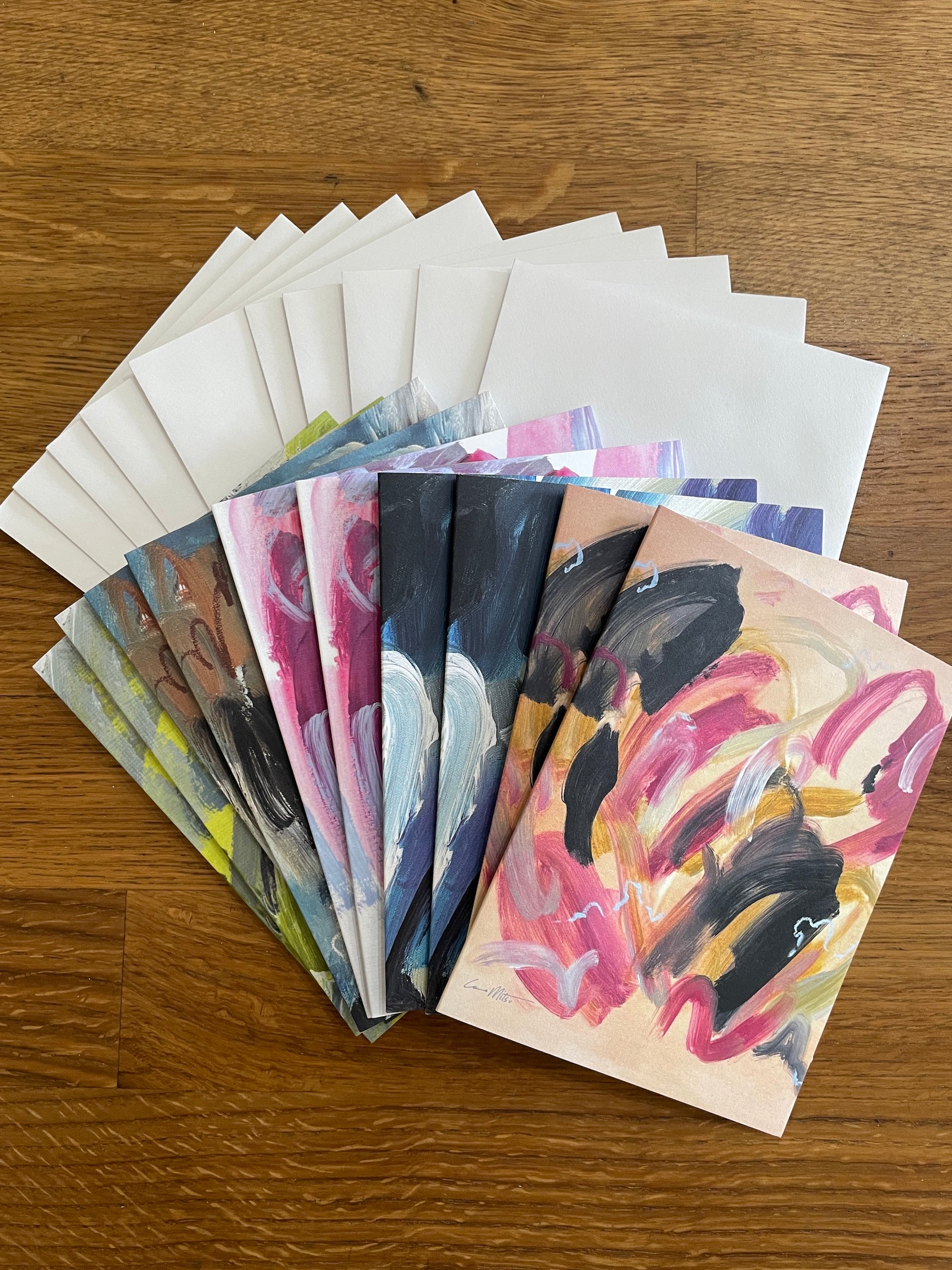 Share art in everyday moments with this 10-pack of vibrant greeting cards, featuring five original abstract paintings by artist Laura Mitsu. Perfect for any occasion, these art cards let you share beauty, inspiration, and connection with loved ones. Whether you’re celebrating a birthday, sending gratitude, or simply saying hello, these art-inspired cards make each message feel extraordinary.