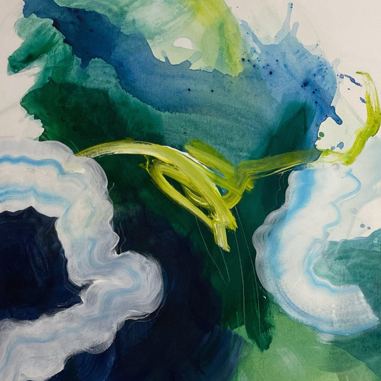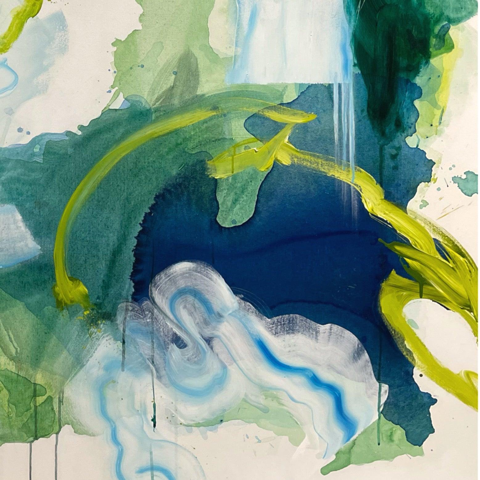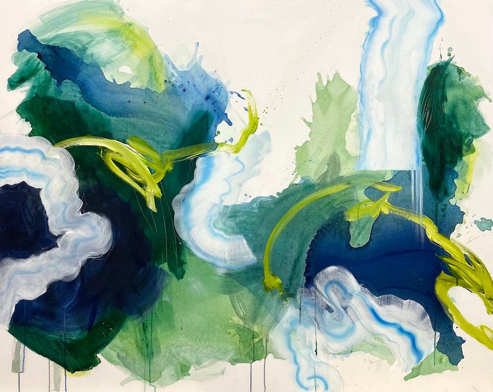 This original abstract painting is full of expressive, gestural brushstrokes and happy accidents. The paint collected where it wanted to in the washes of water -- I couldn't have planned this painting even if I tried. Everything about it was experimental and bold. Creating this felt like journeying into uncharted waters.