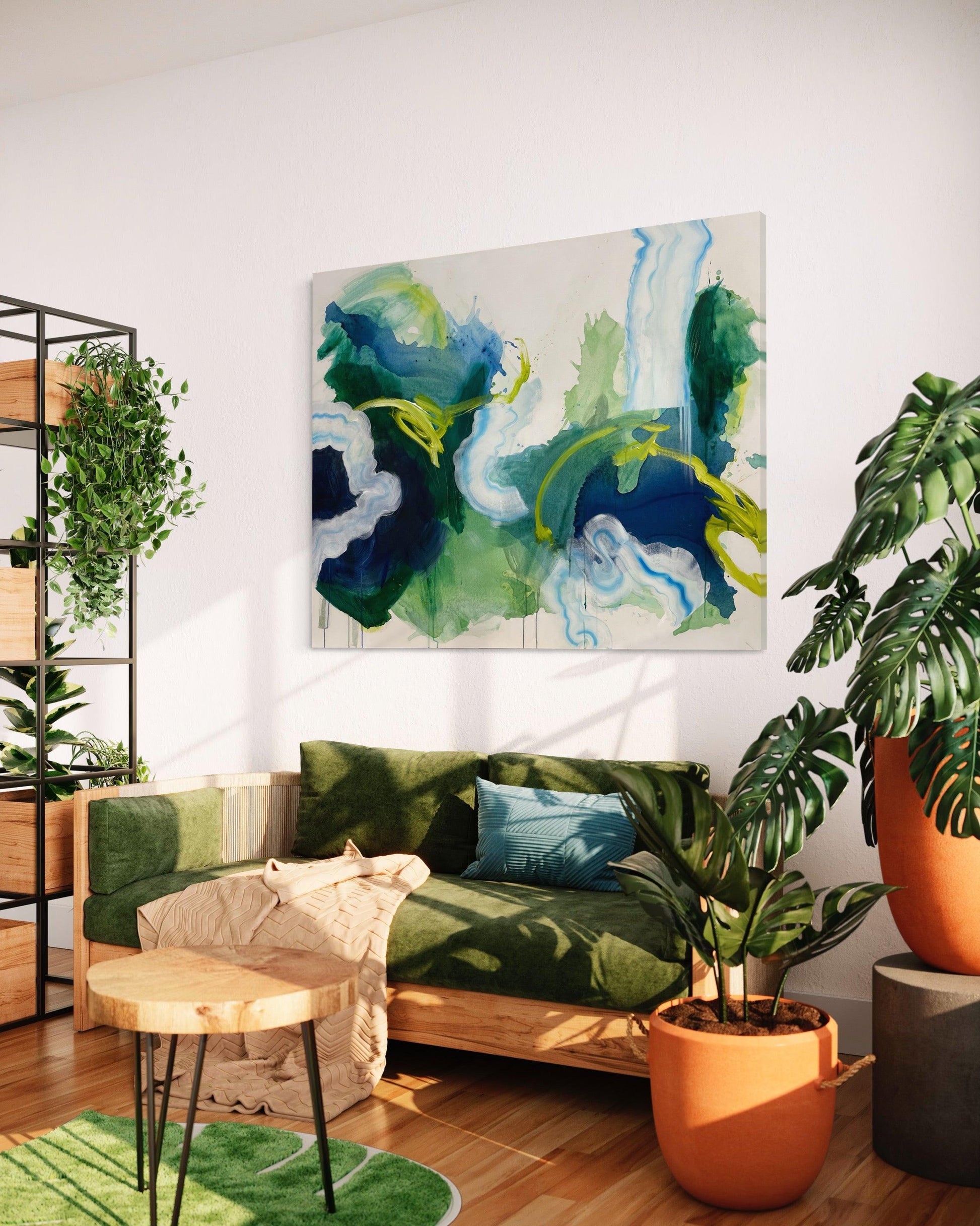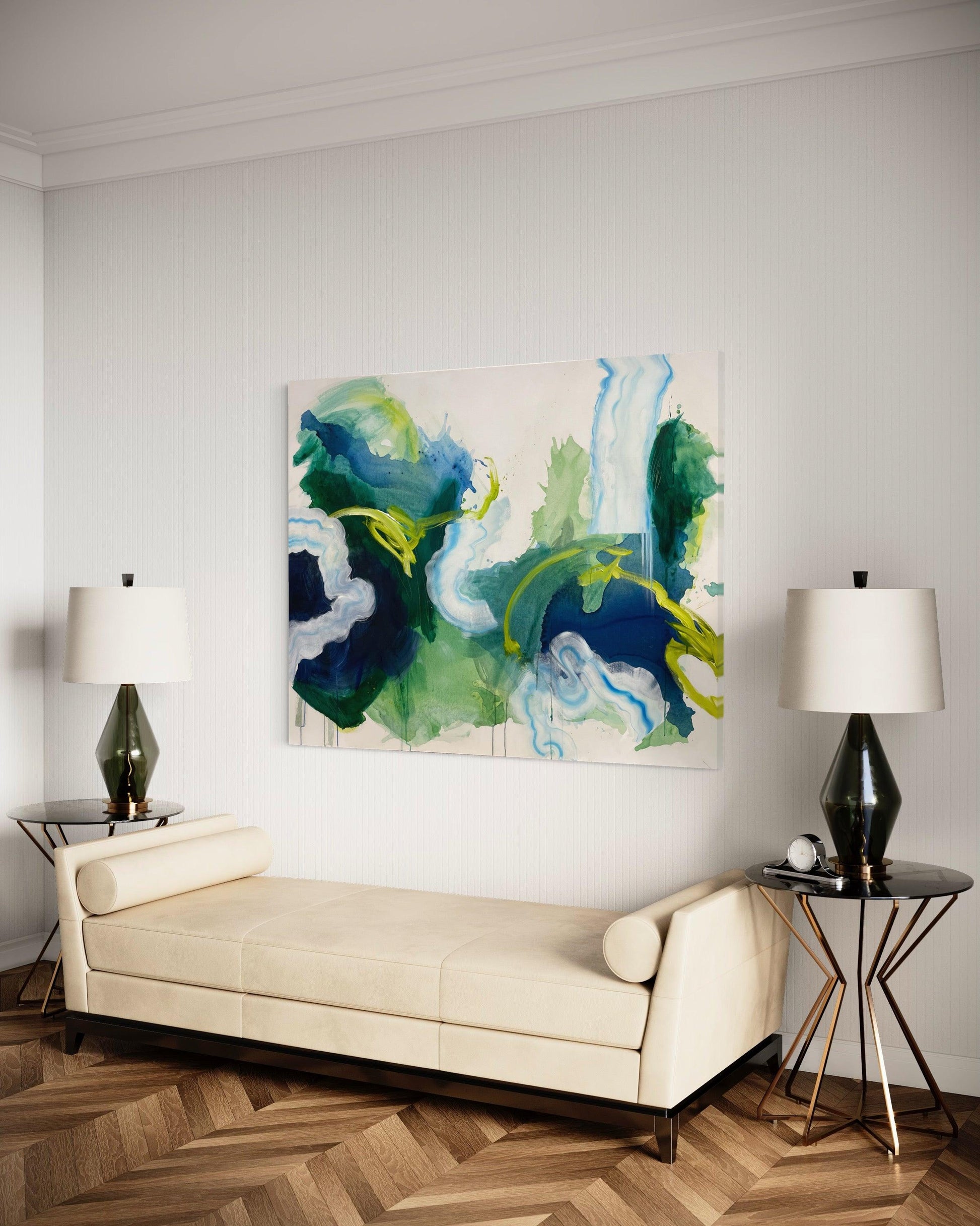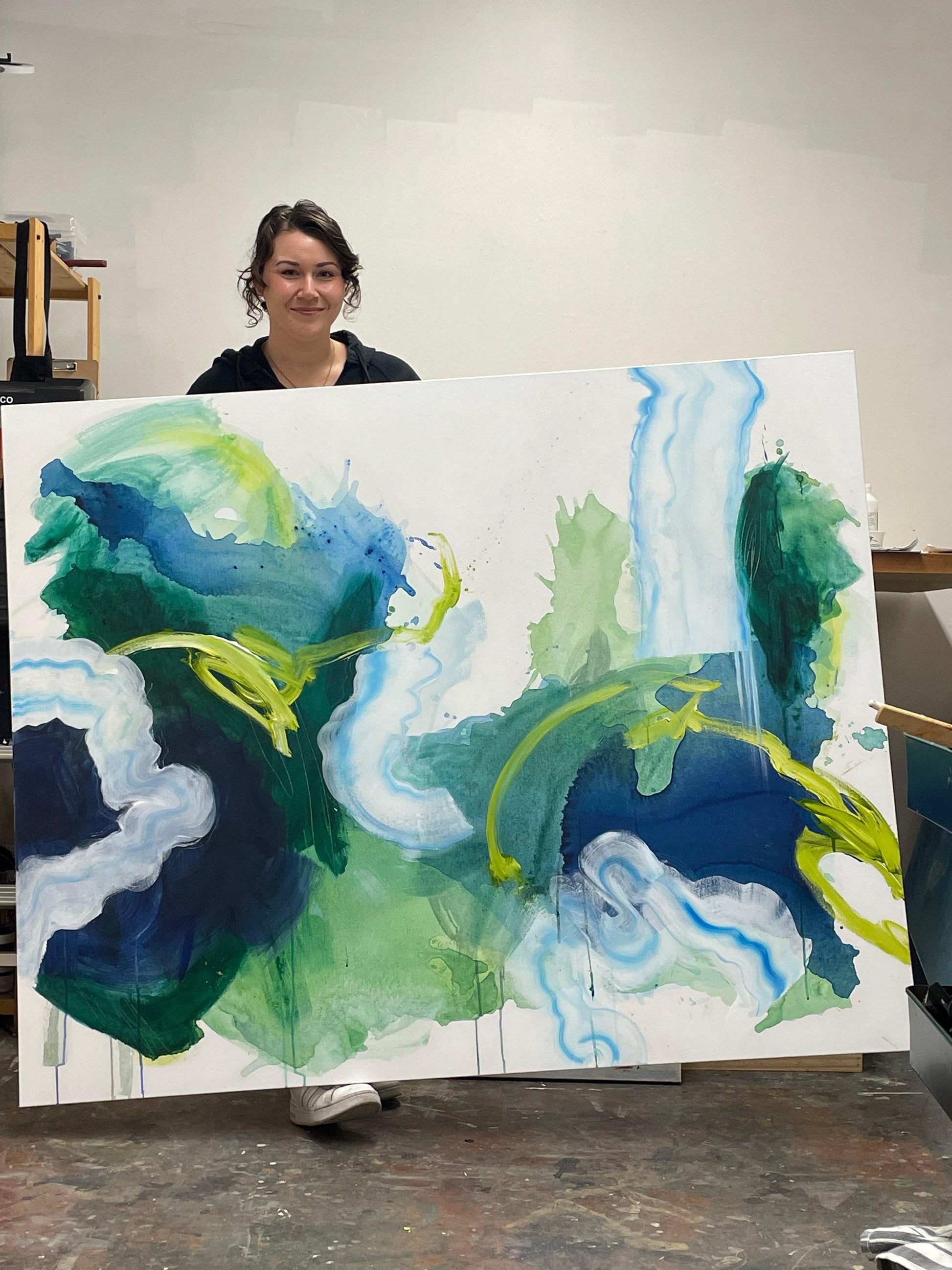 This original abstract painting is full of expressive, gestural brushstrokes and happy accidents. The paint collected where it wanted to in the washes of water -- I couldn't have planned this painting even if I tried. Everything about it was experimental and bold. Creating this felt like journeying into uncharted waters.