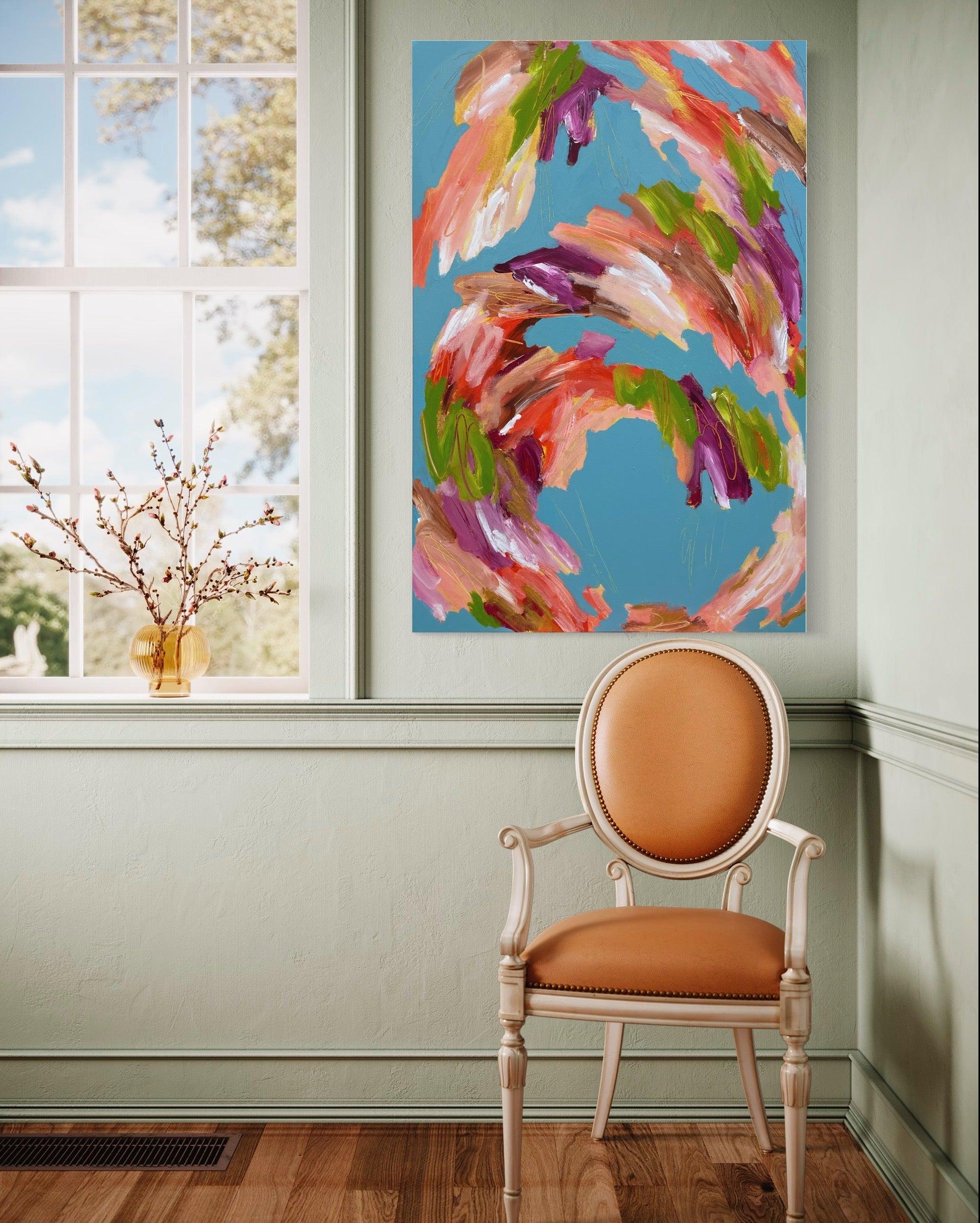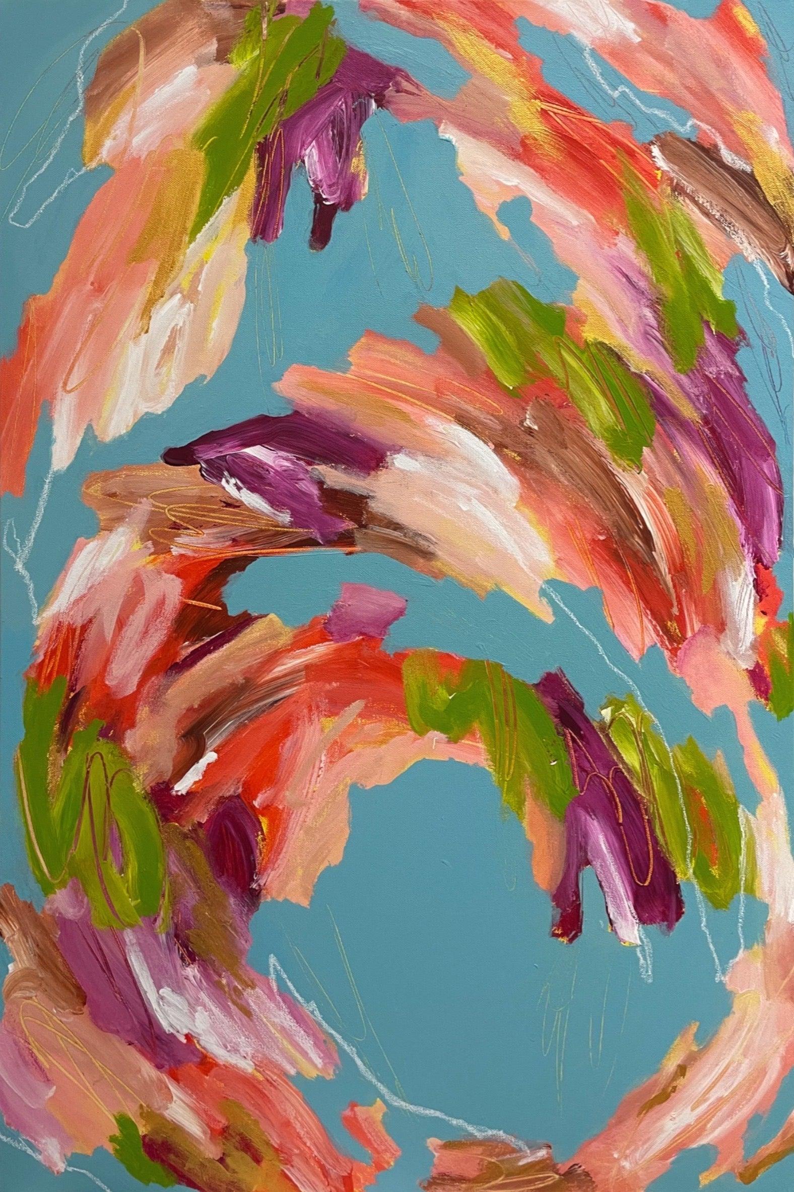 "Flower Tunnel" is reminiscent of a blooming flower arch in a magnificent garden, filled with pinks, purples, browns, and greens. The gold paint I added shines warmly in the light, adding a magic sparkle to this. You feel surrounded by the floral energy, and it's almost as if you can smell the fragrant blooms, as you look up against the blue spring sky. The delicate hand-drawn lines dance through the painting, bringing the viewer a feeling of connectedness.