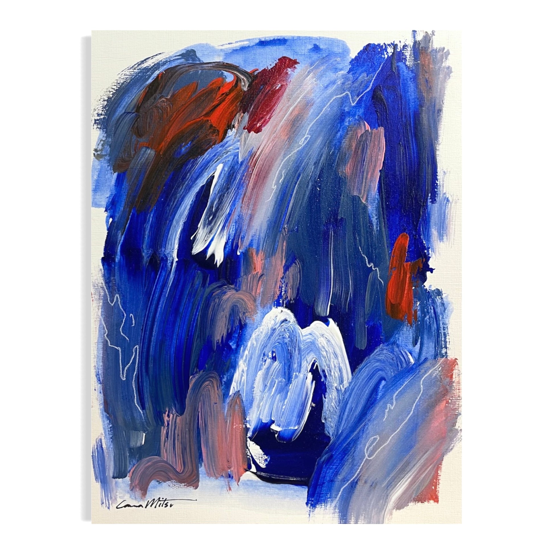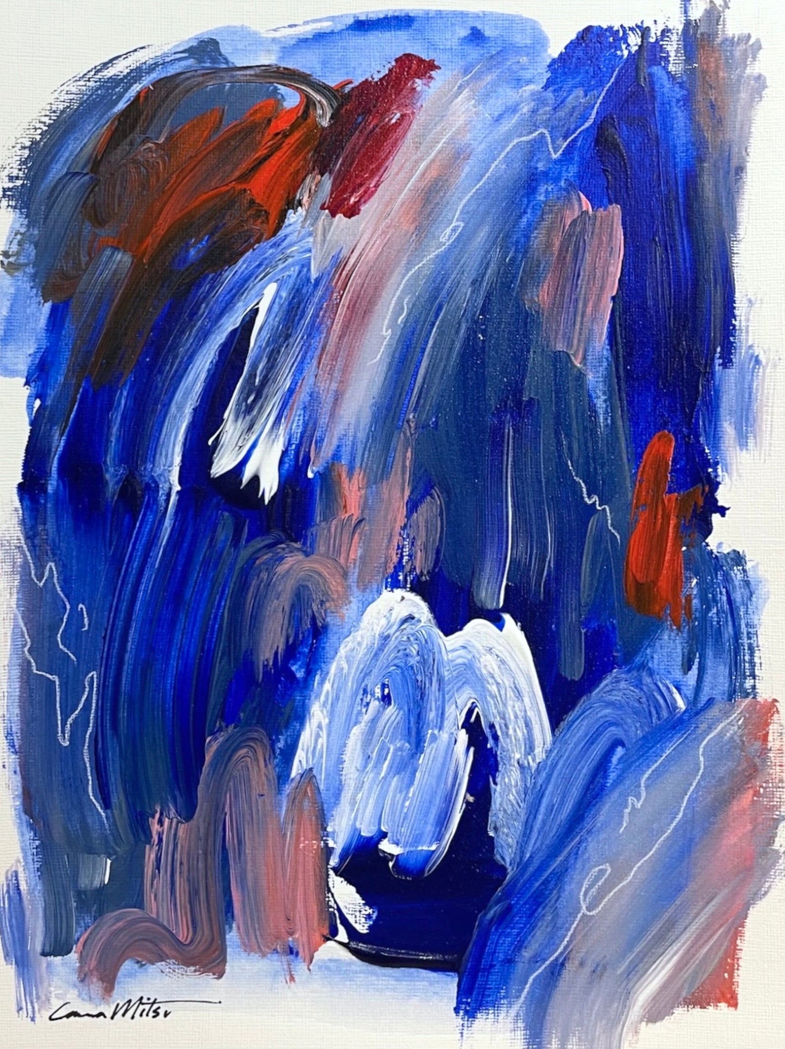 A quiet certainty runs through this piece—like something true resurfacing from beneath the noise. Deep blue anchors the work with presence, while orange and soft pink bring warmth and movement. Delicate white charcoal lines drift across the surface like soft breath or a fleeting memory.