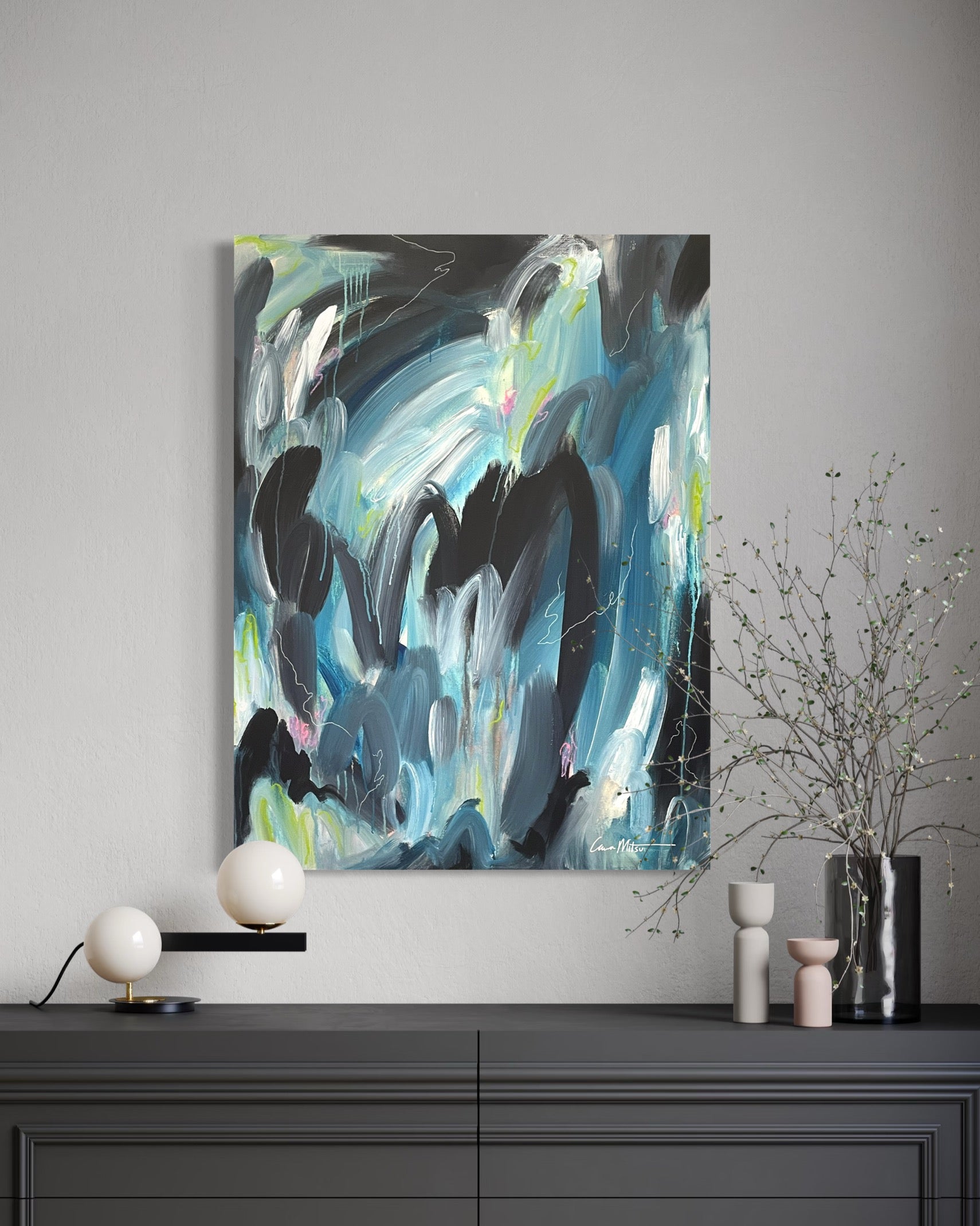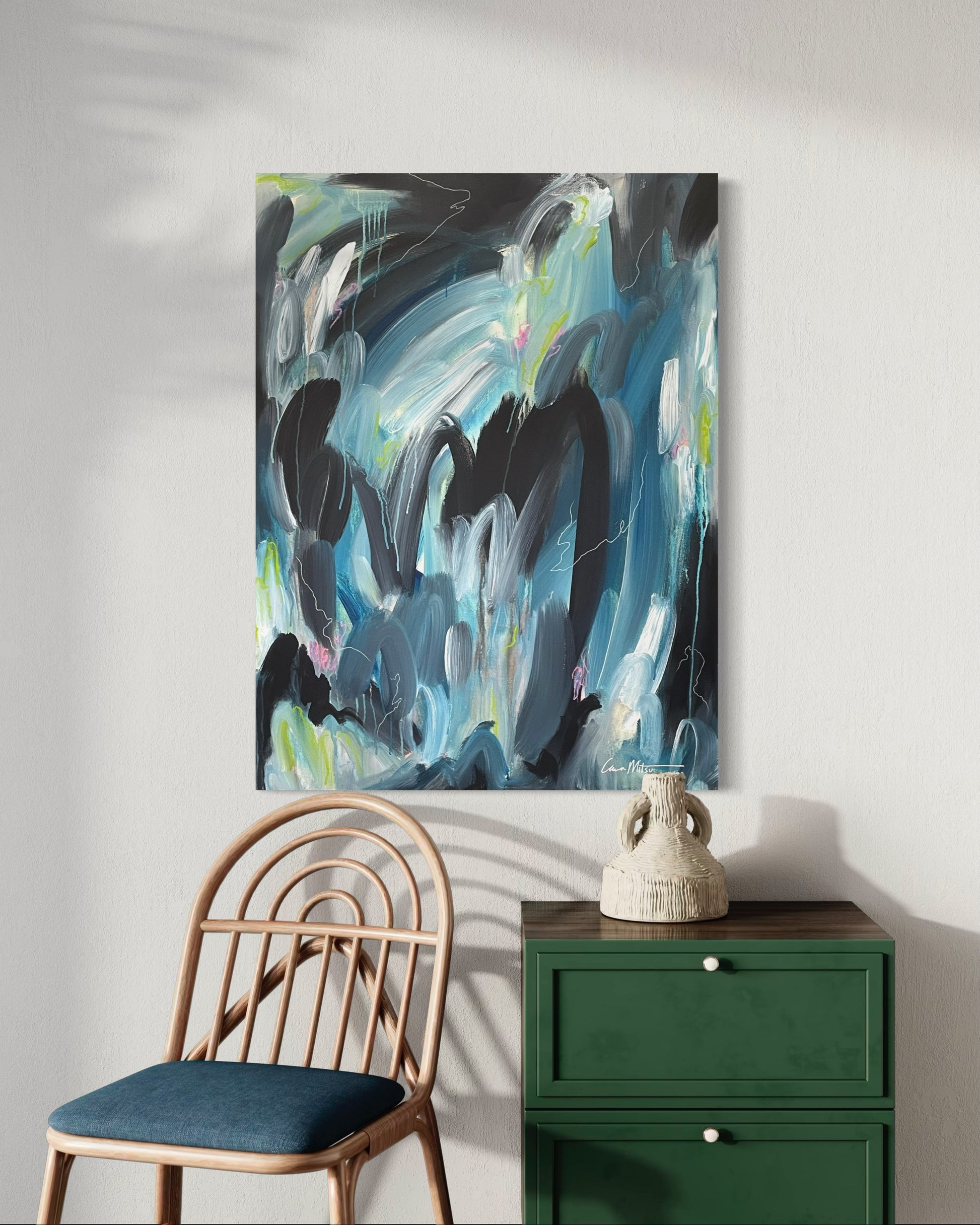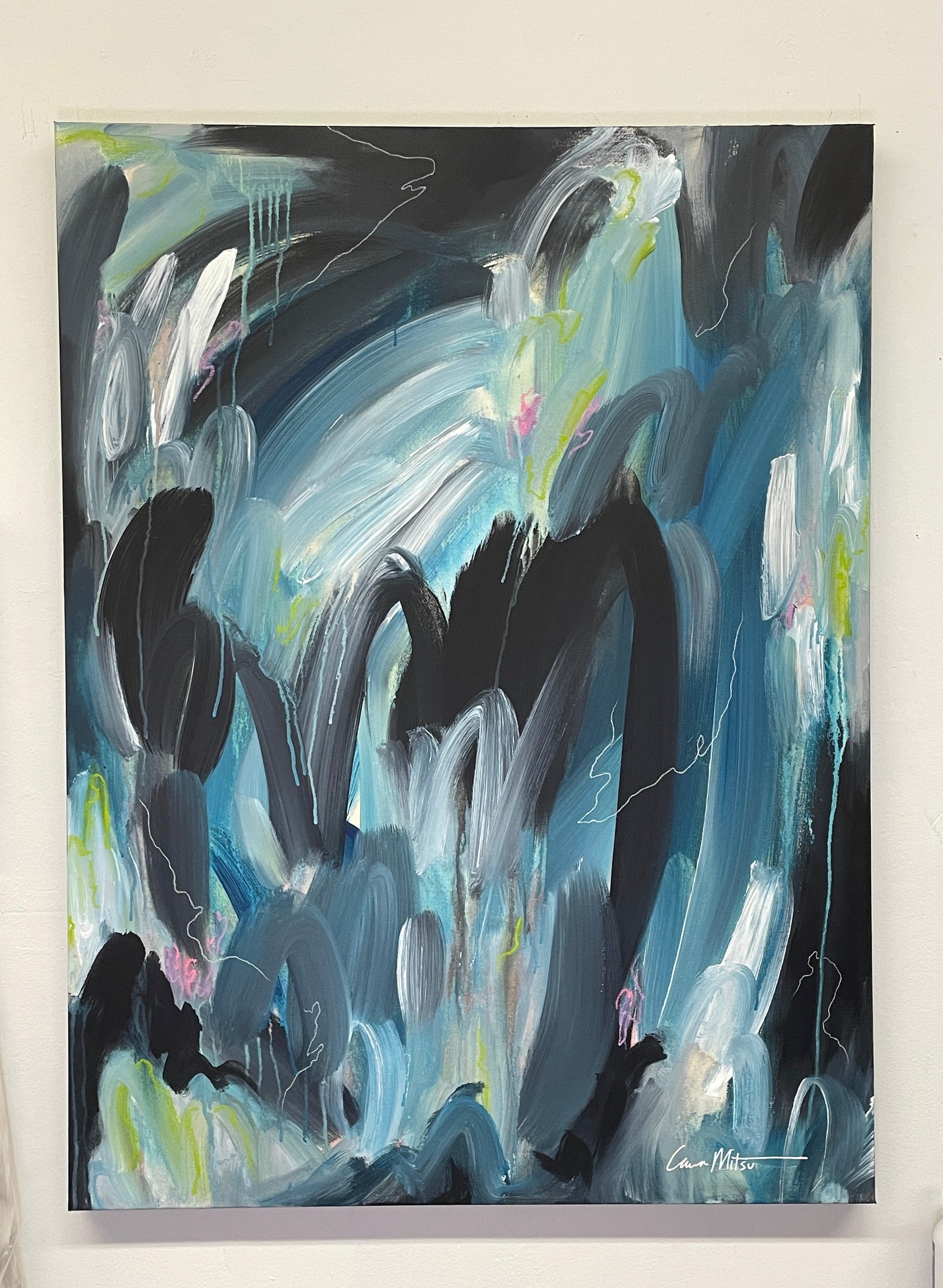 Loose Threads is a vibrant expression of movement and emotion. Swooshing strokes of blue and green collide and bleed into each other, evoking energy and fluidity. Delicate white charcoal lines weave through the surface like subtle whispers—threading their way across color-washed layers. Small, intentional pops of green, pink, and purple oil stick bring dimension and surprise, like fragments of thought caught mid-motion. A piece that speaks to what connects us—and what we’re still unraveling.