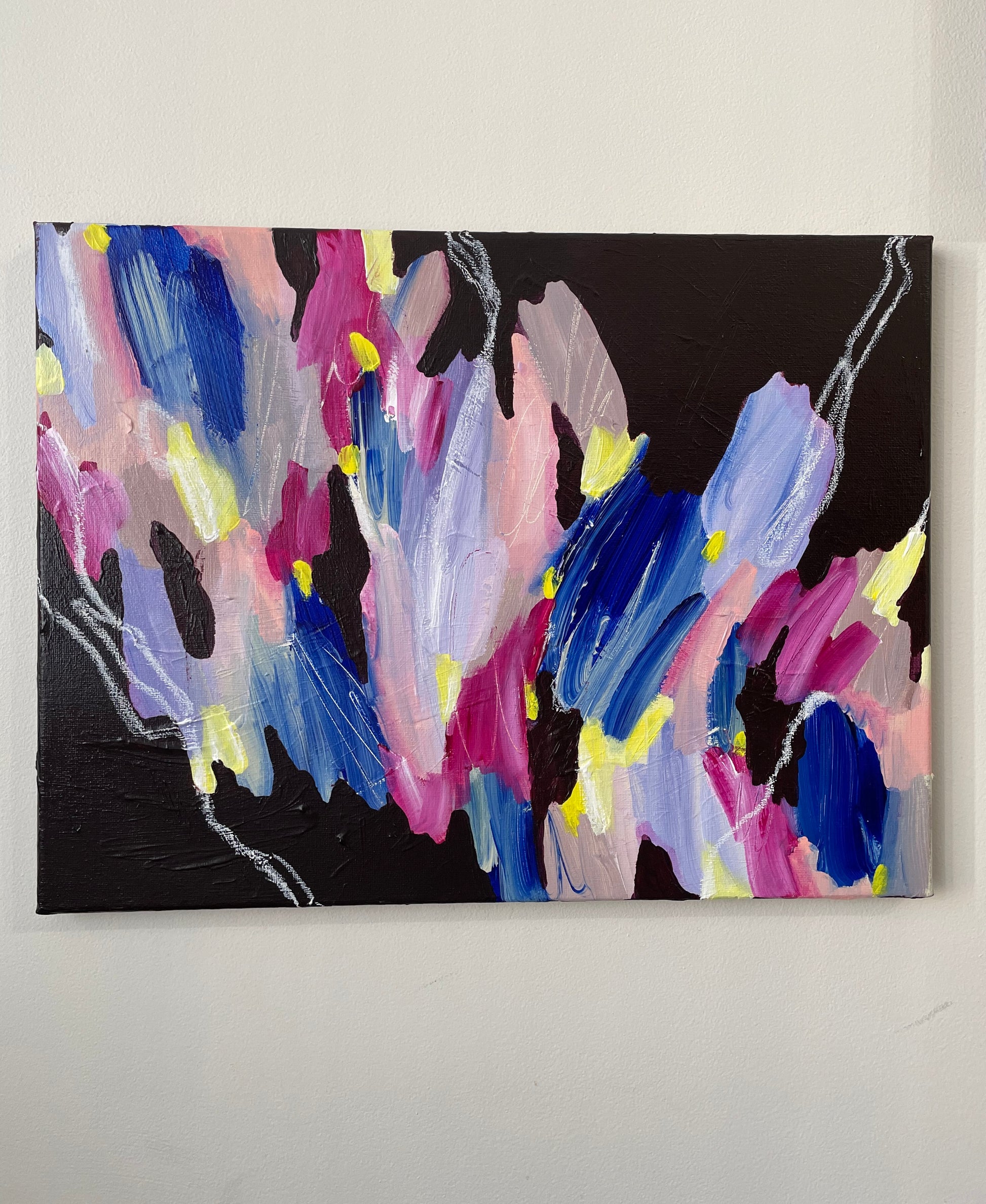 The organic shapes and negative space I created in this painting create a web of shapes, colors, and light. I used soft colors here to invoke a sense of calm, nostalgia, and wonder, like admiring a cotton candy sunset on a spring night. The lines throughout my work are subtle reminders that everything is connected.