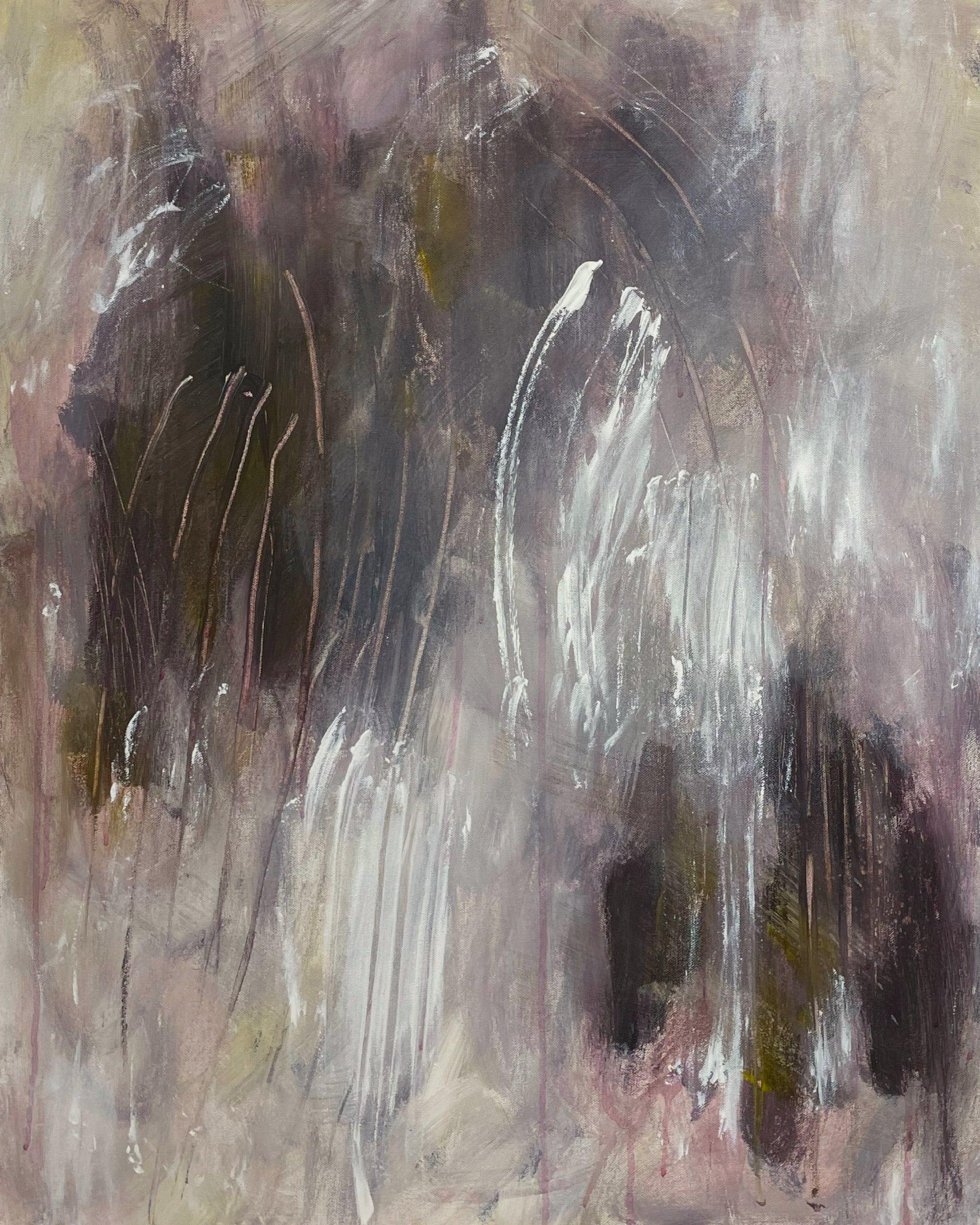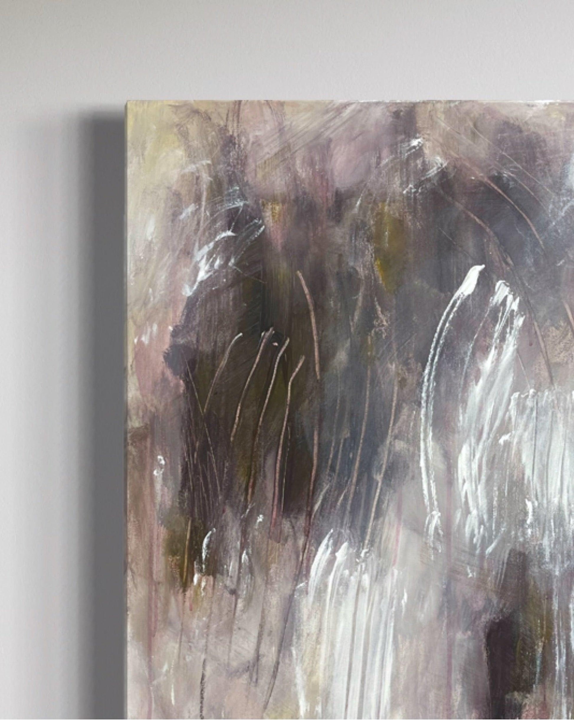 This original abstract painting I painted with my hands, and you can see the physical marks I made with my fingers and nails in the paint. Soft purple and yellow colors dance around the light and the dark parts, like the parts of ourselves we find hard to accept and lightness we feel when we finally do.