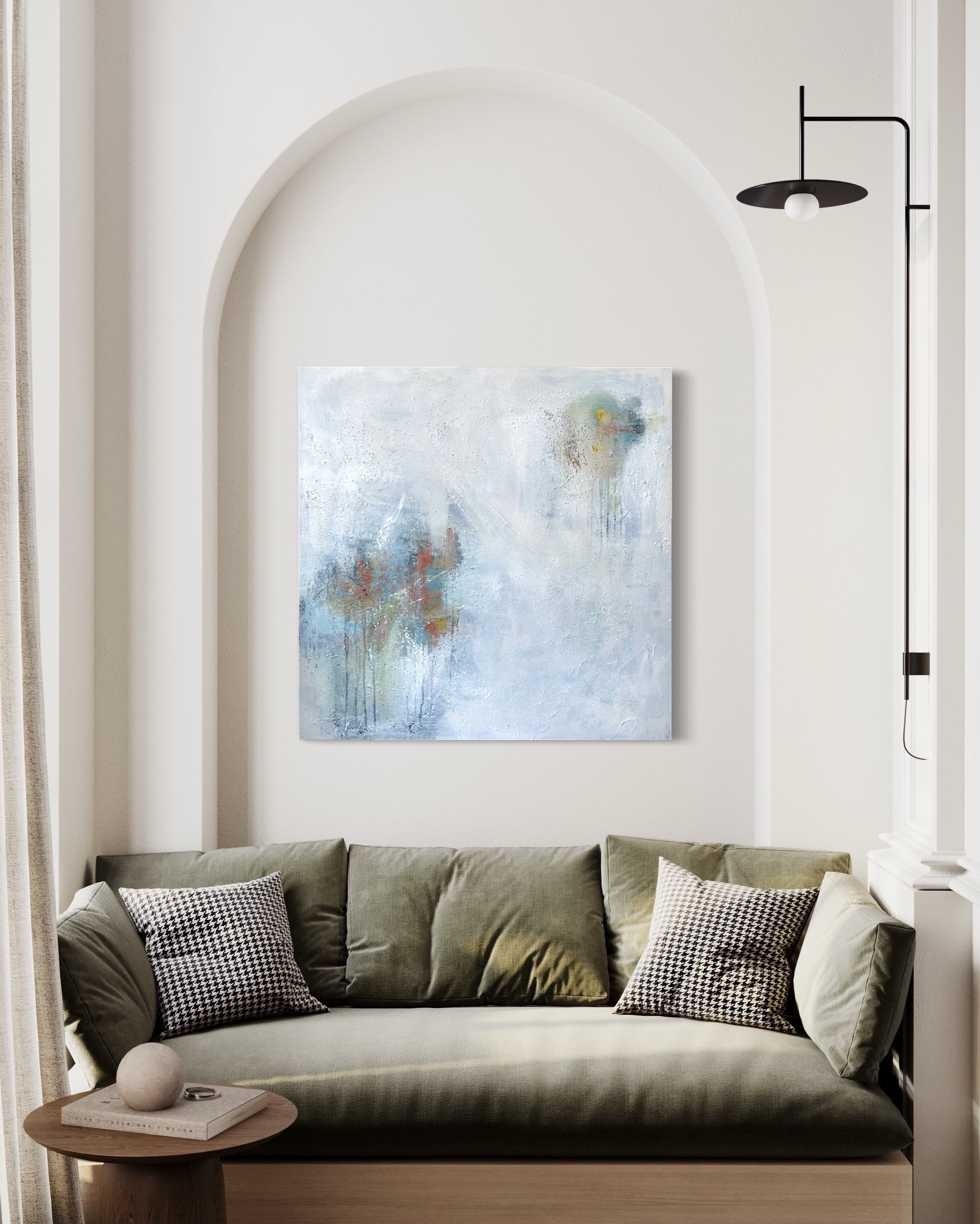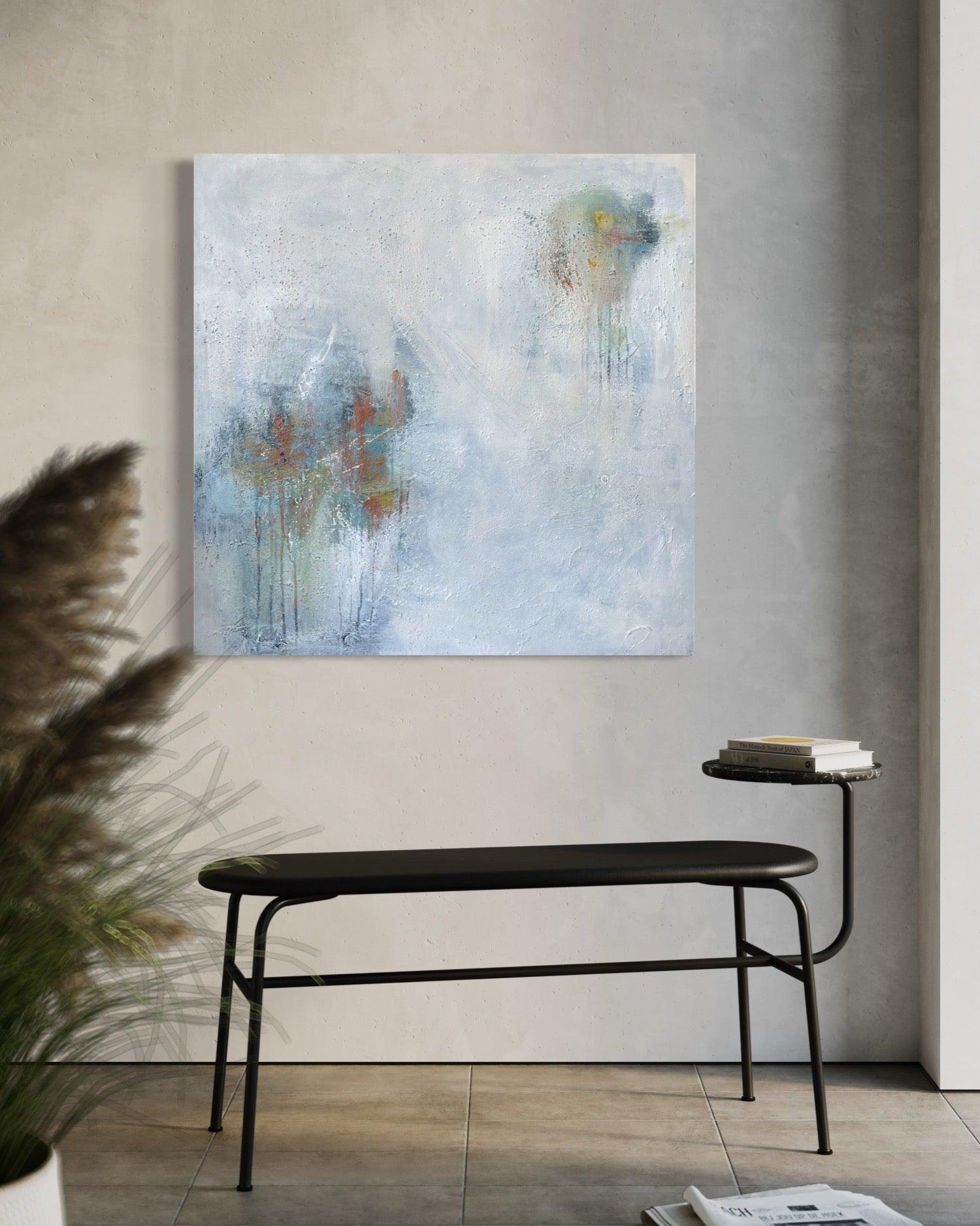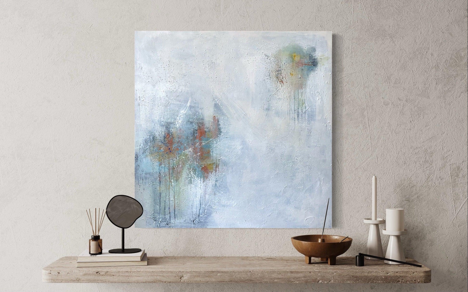 This painting has bright, organic shapes peering through the veil of the white layers. Orange, blue, green and yellow can be seen under the white. There is heavy texture across the entire canvas that adds interest and depth.